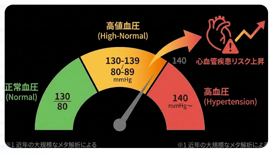 しかし、近年の大規模なメタ解析により、140mmHgを下回る「高値血圧(130〜139/80〜89mmHg)」の段階であっても、心血管疾患の発症リスクが有意に上昇することが明らかになっています。※1